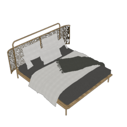 11新中式双人床,床品,床尾凳,床头柜,台灯,金属镂空隔断屏风,床头壁画硬包背景墙,摆件